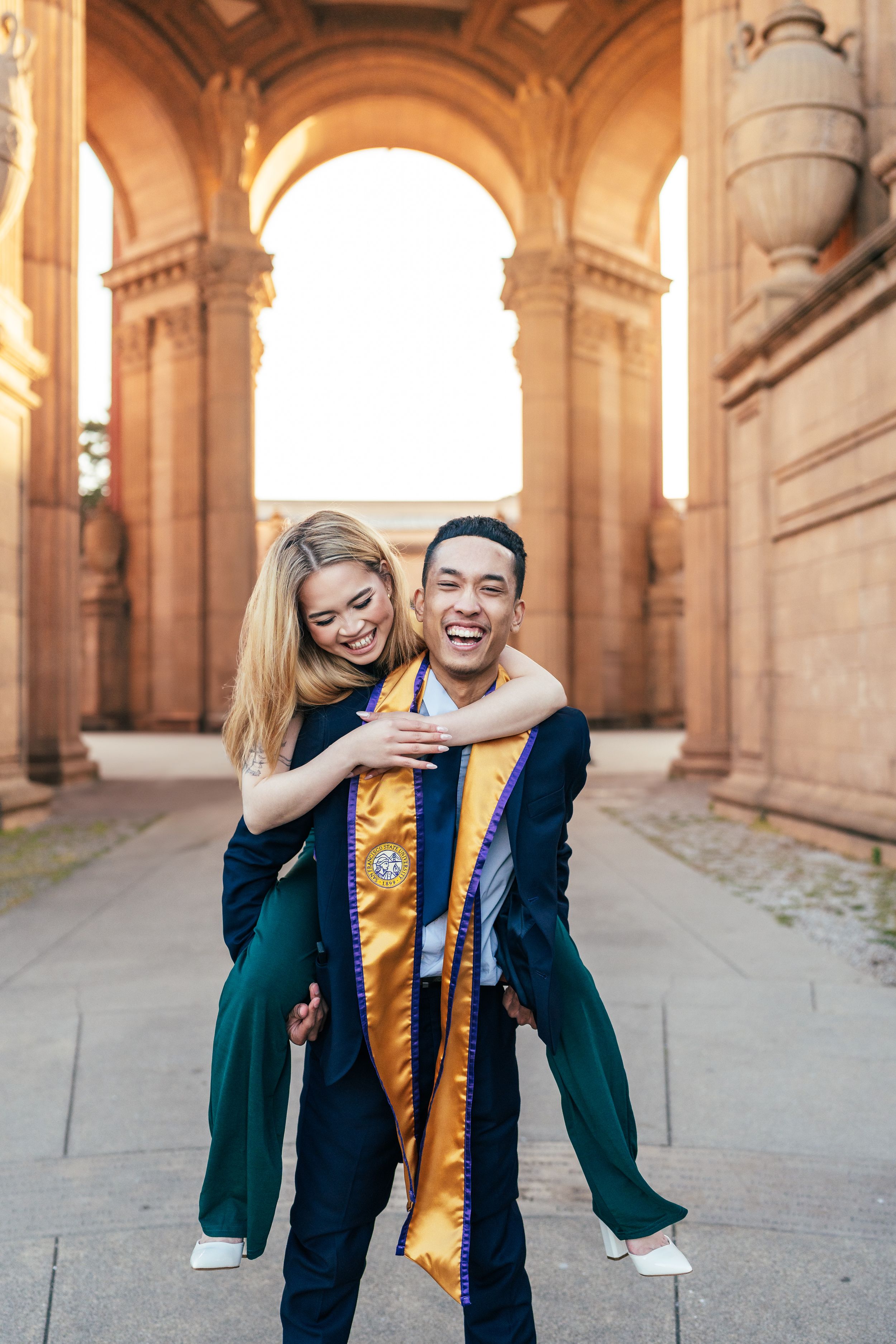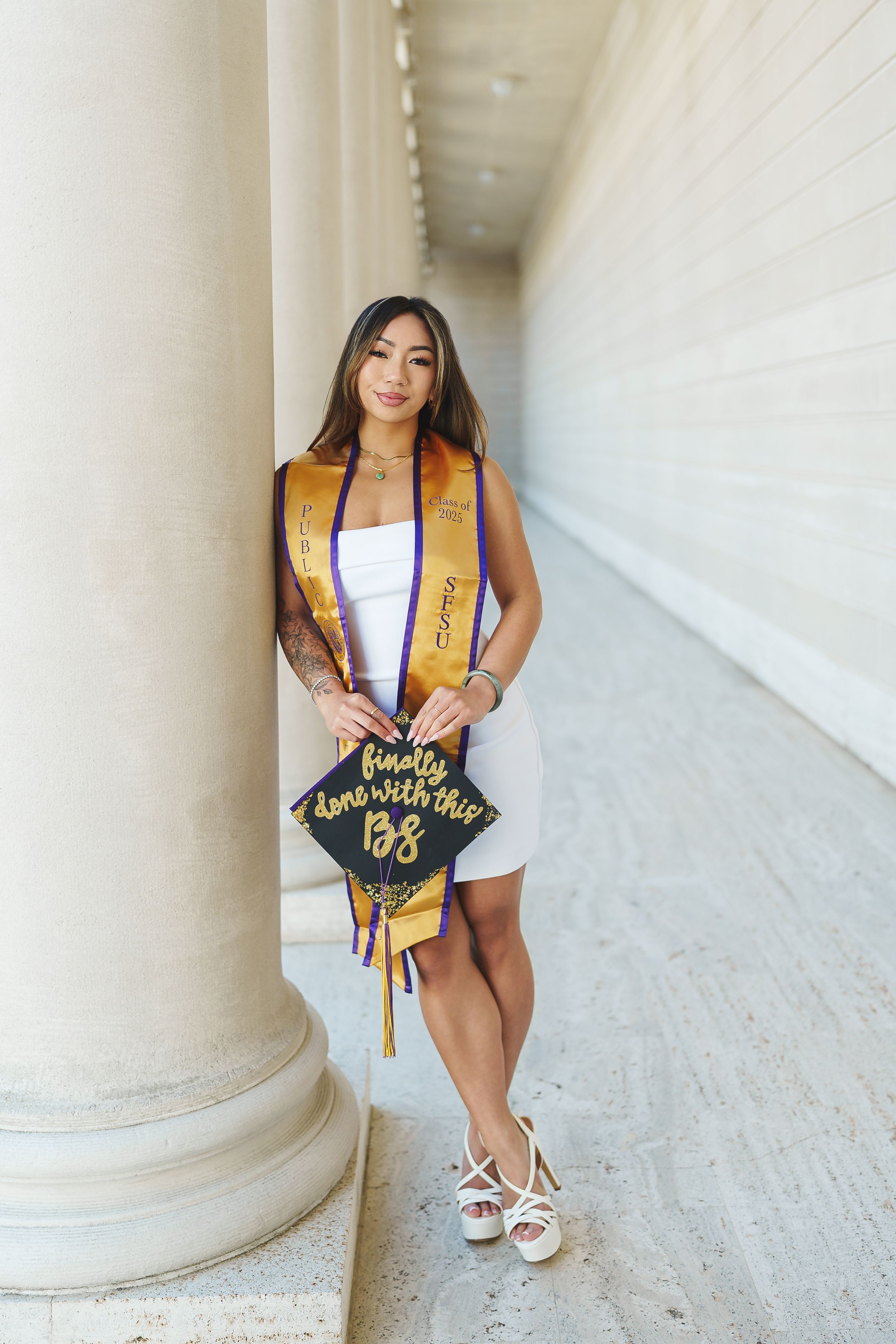 Campus portraits, cap-and-gown details, friend groups, and gallery-ready milestone images.